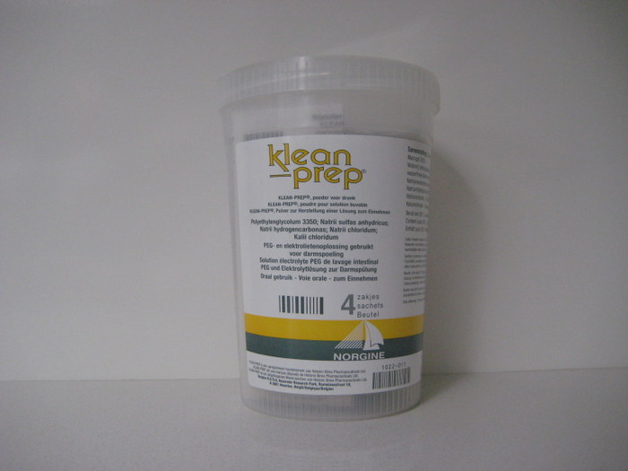 Belangrijk: Eet geen vast voedsel meer ten minste 2 uur vóór de toediening van Klean-Prep tot aan het einde van het onderzoek. Heldere dranken (thee zonder melk, niet alcoholische dranken) zijn wel toegelaten.