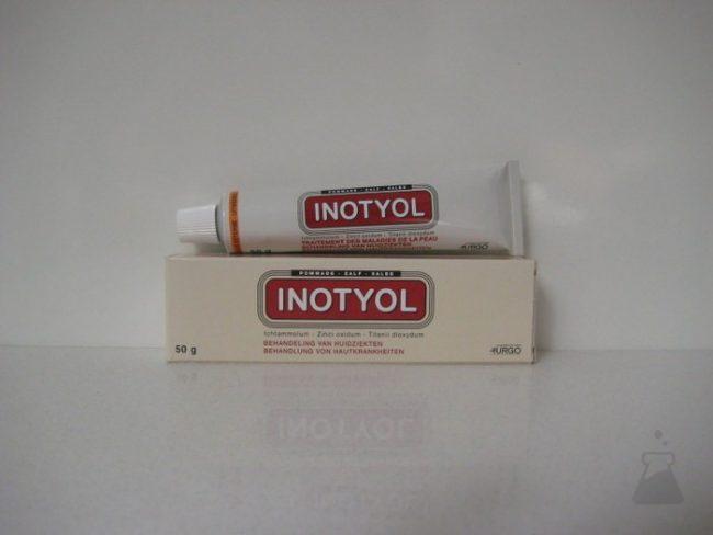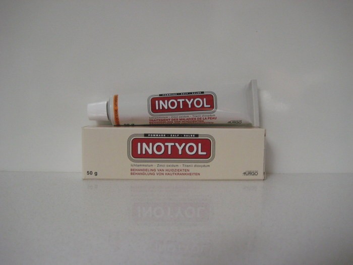 De werkzame stoffen in Inotyol zijn: ichtammol 1,50 g – zinkoxide 15,0 g – titaandioxide 5,00 g per 100,00 g zalf – De andere stoffen in Inotyol zijn: wolvet – vloeibare paraffine – vaseline – lavendel essentiële olie – gezuiverd water. Voor wolvet (lanoline)
