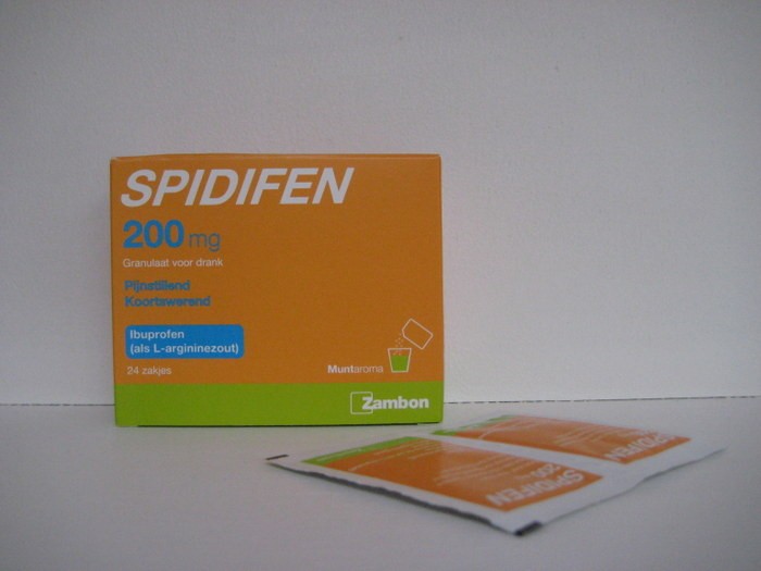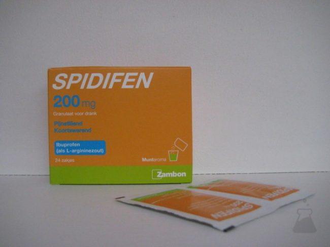 Spidifen 200 mg granulaat voor drank: – De werkzame stof in dit middel is ibuprofen (als L-argininezout). Eén zakje bevat 200 mg ibuprofen. De andere stoffen (hulpstoffen) in dit middel zijn L-arginine – natriumbicarbonaat – natriumsaccharine – aspartaam – saccharose – muntaroma.